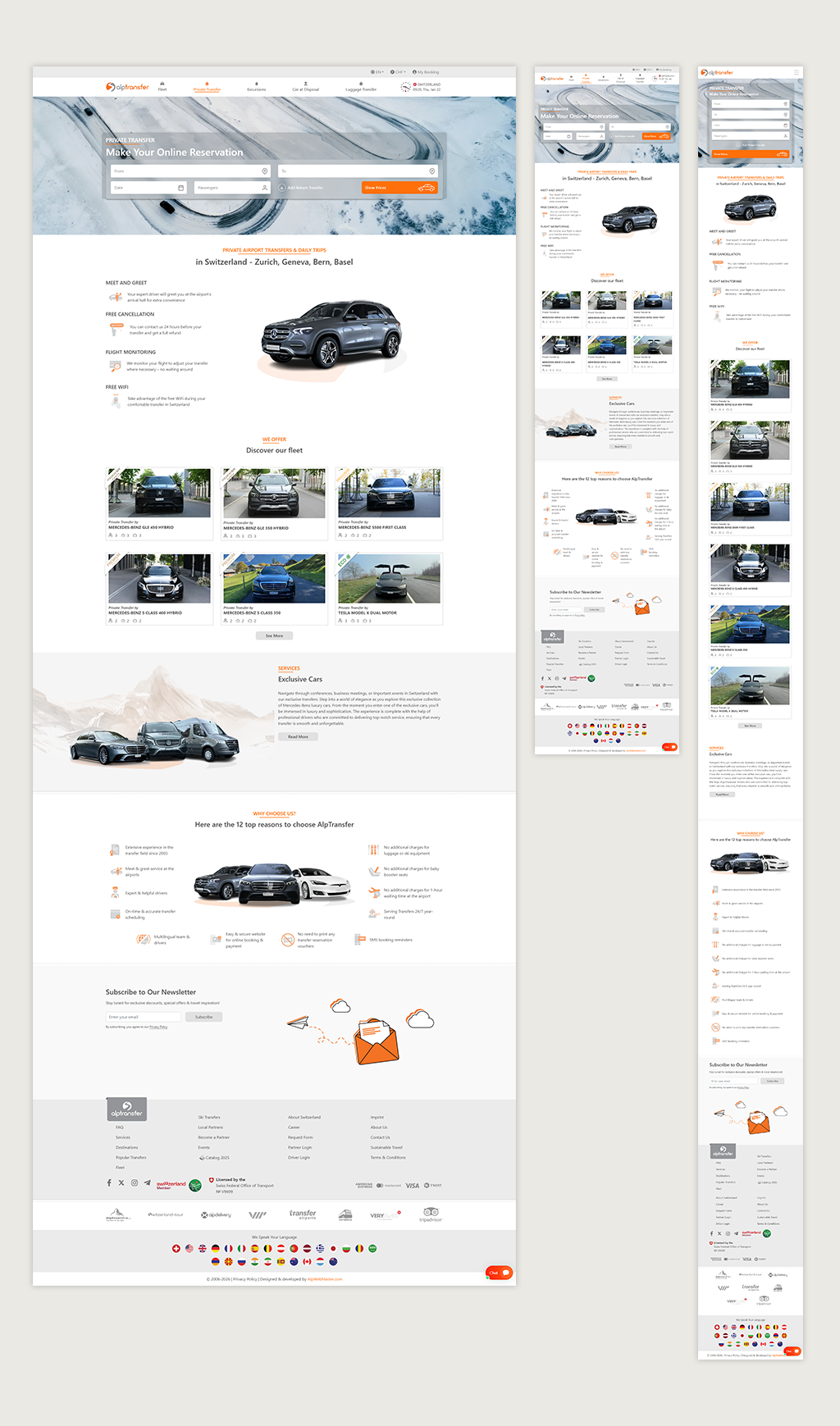 UX/UI design for a premium private transfer service offering Airport Transfers, Car at Disposal, and Luggage Transfer, supported by a professional fleet, transparent services, and a seamless booking experience. The project focuses on simplifying the booking flow, clearly presenting vehicle options and pricing, and creating a premium visual identity that reflects reliability and comfort. Continuous improvements are made based on user behavior, feedback, and evolving business needs.